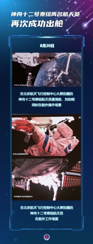新华社北京8月20日电(李国利、邓孟)8月20日8时38分,神舟十二号航天员聂海胜成功开启天和核心舱节点舱出舱舱门,截至10时12分,航天员聂海胜、刘伯明身着中国自主研制的新一代“飞天”舱外航天服,先后从天和核心舱节点舱成功出舱,并完成在机械臂上安装脚限位器和舱外工作台等工作。后续,他们将在机械臂支持下,相互配合开展空间站舱外有关设备安装等作业。