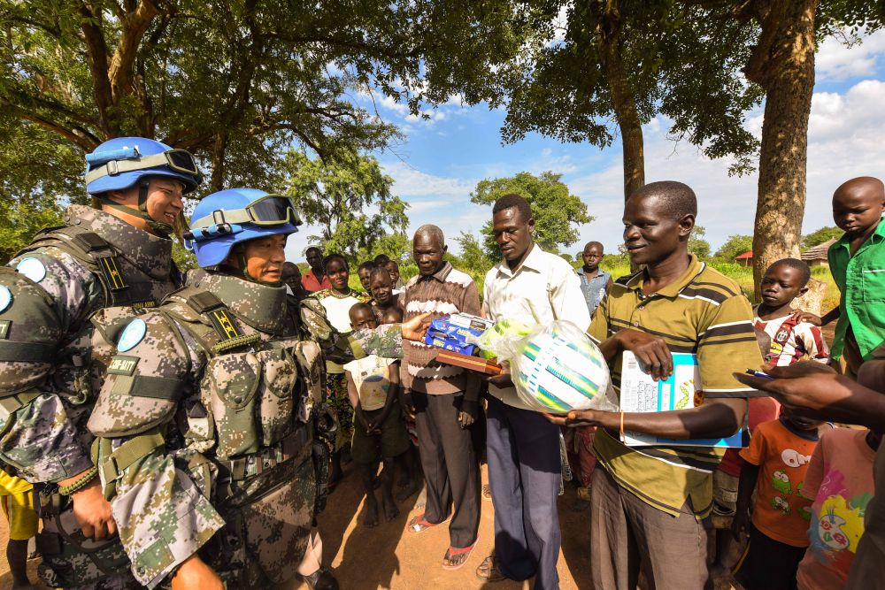 2015年8月26日,中国赴南苏丹维和步兵营官兵在执行任务途中,看望当地小学师生,送去各类紧缺的学习和文体用品。
