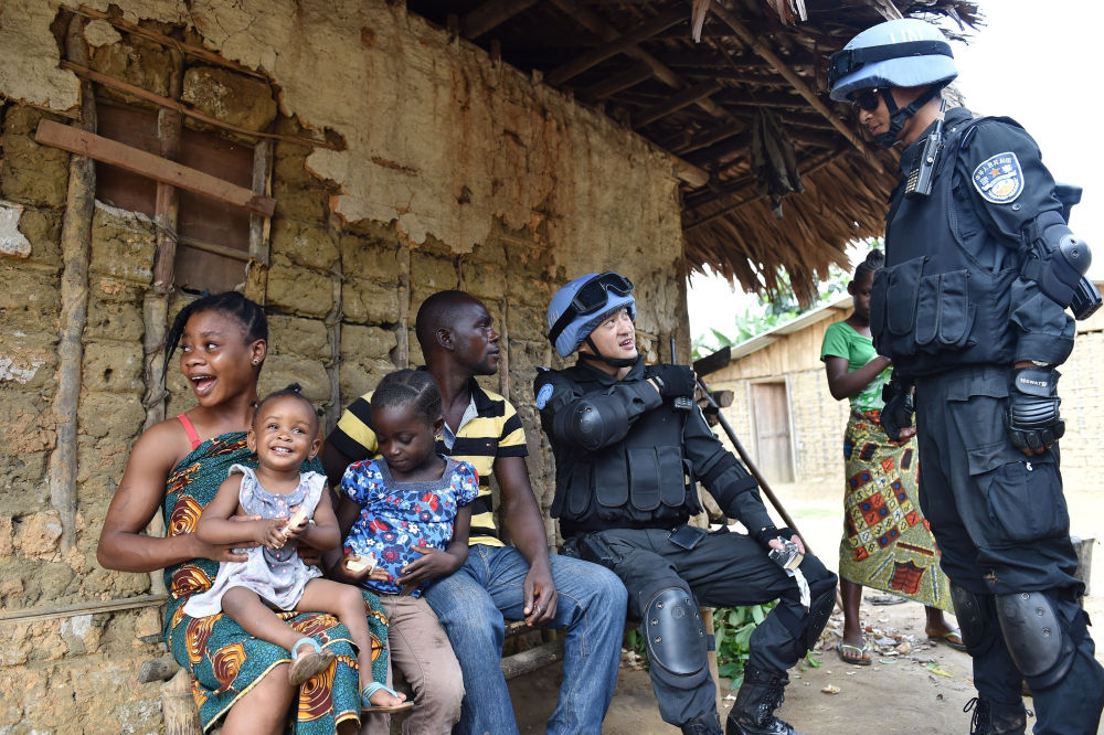 2015年11月3日,中国维和警察防暴队队员在利比里亚格林维尔的一座村庄询问当地治安等情况。
