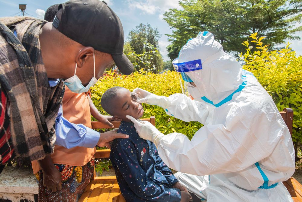 2021年6月1日, 在刚果(金)东部城市布卡武的SOS儿童村,中国第24批赴刚果(金)维和医疗分队的医护人员为孩子检查身体。