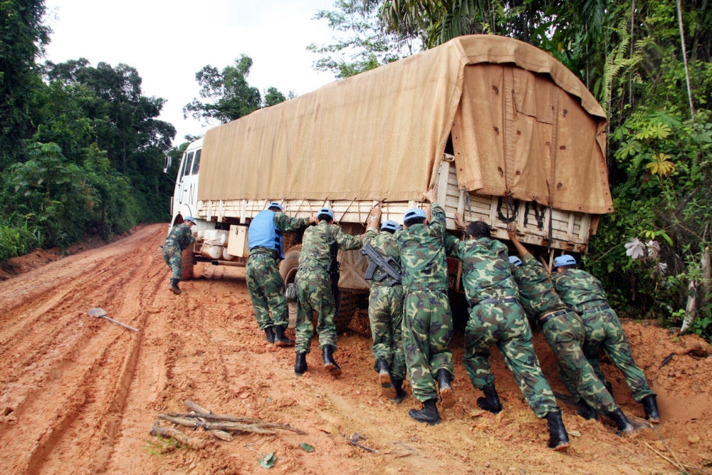 2006年6月2日,在利比里亚蒙罗维亚,中国驻利比里亚维和运输分队的士兵合力推动陷在泥泞中的车辆。