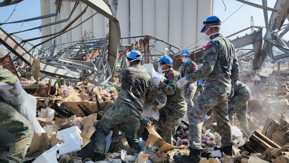 2020年9月30日,中国维和官兵在黎巴嫩首都贝鲁特港口区爆炸现场清理仓库废墟中的可用物资。