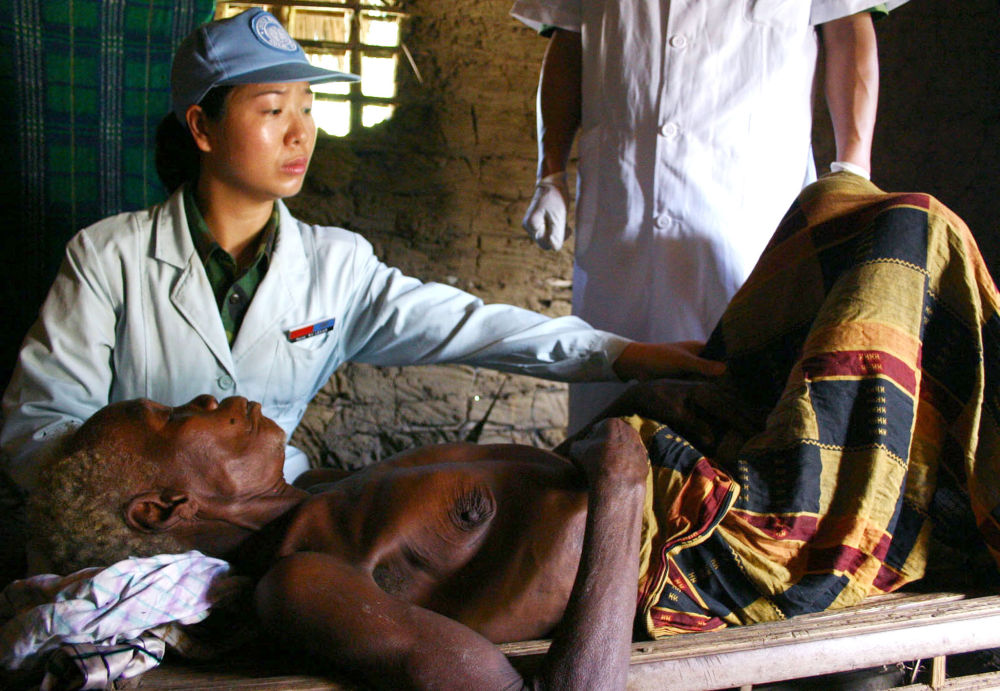 2004年10月10日下午,在利比里亚绥德鲁附近村庄,中国赴利比里亚维和医疗分队护士长吴乐燕为一名95岁的村民做检查。