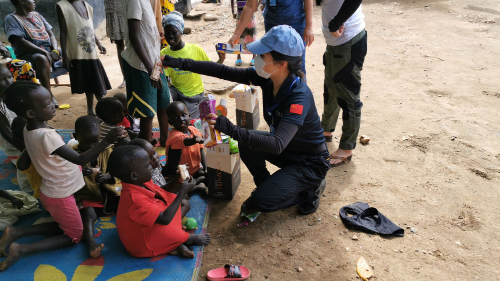 2020年10月,在南苏丹首都朱巴,中国维和警察廖洁慰问当地孤儿院的儿童。