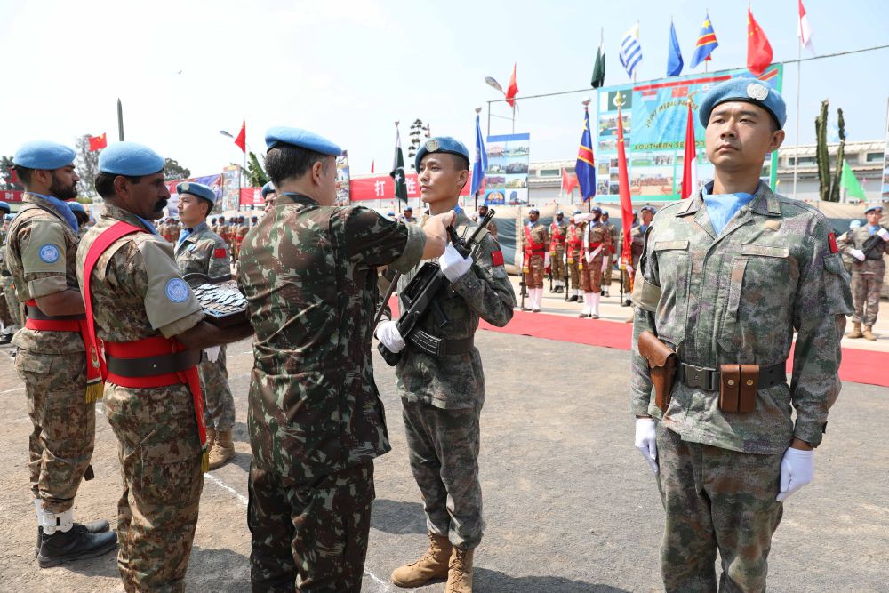 2021年7月12日,在刚果(金)布卡武中国维和部队营区举行的授勋仪式上,中国维和官兵被授予联合国“和平勋章”。