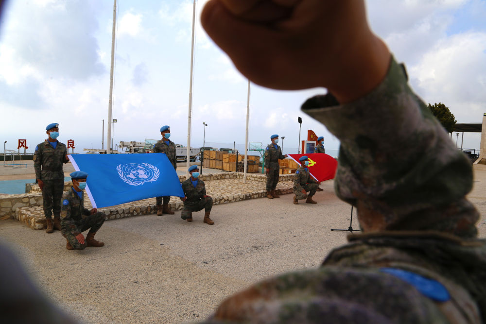 2022年5月1日,在黎巴嫩南部提尔市沙马村的中国维和营区,中国第20批赴黎巴嫩维和建筑工兵分队的官兵们面向党旗和联合国旗重温维和誓词。