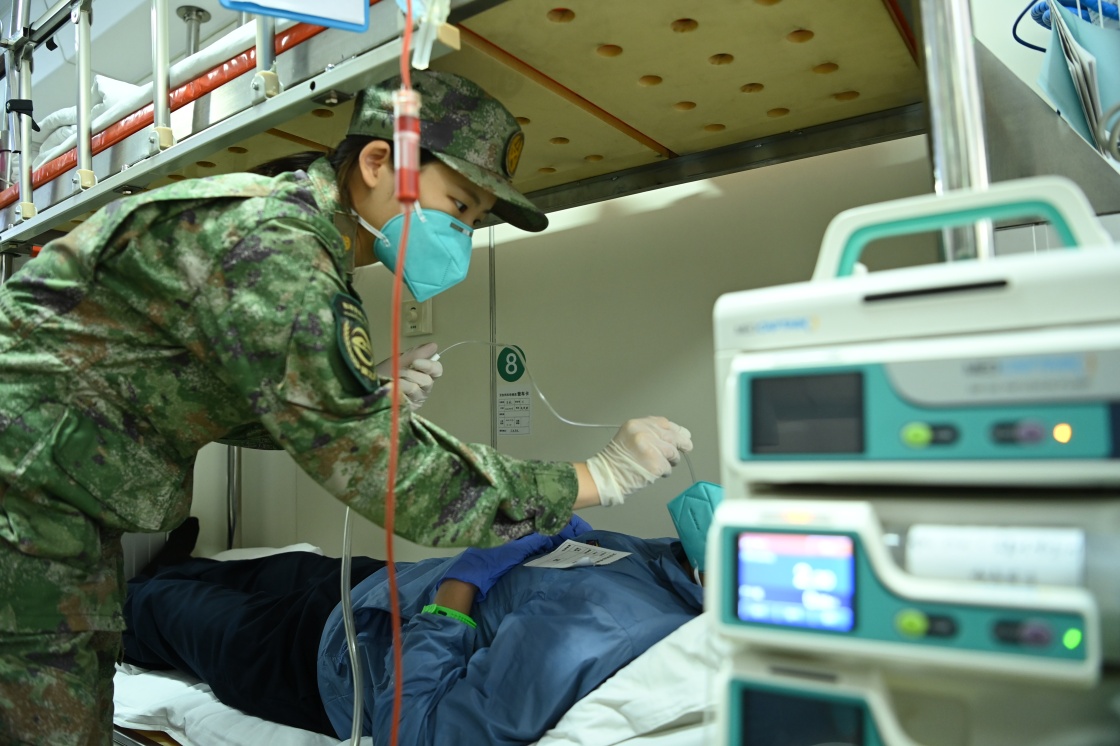 7月22日,重症救治组医护人员在卫生列车重症监护车厢进行床旁救护演练。新华社发(曾理摄)