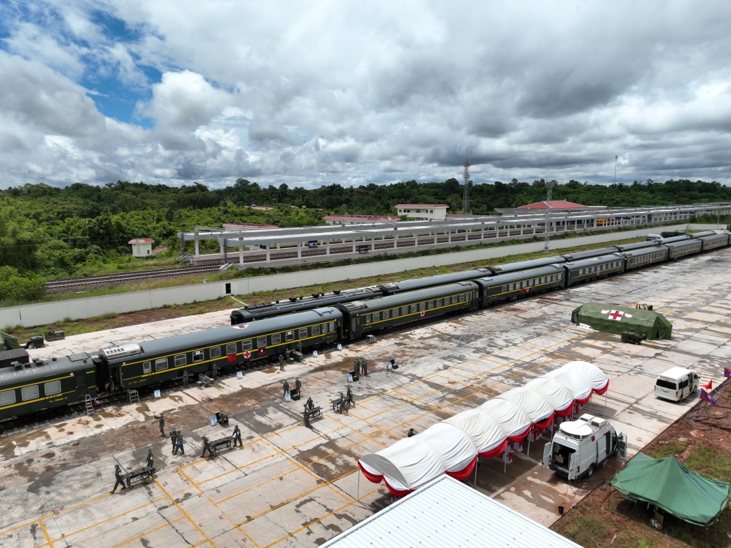 7月22日,在中老铁路老挝蓬洪站,“和平列车-2022”联合演训有序展开(无人机照片)。新华社发(曾理摄)