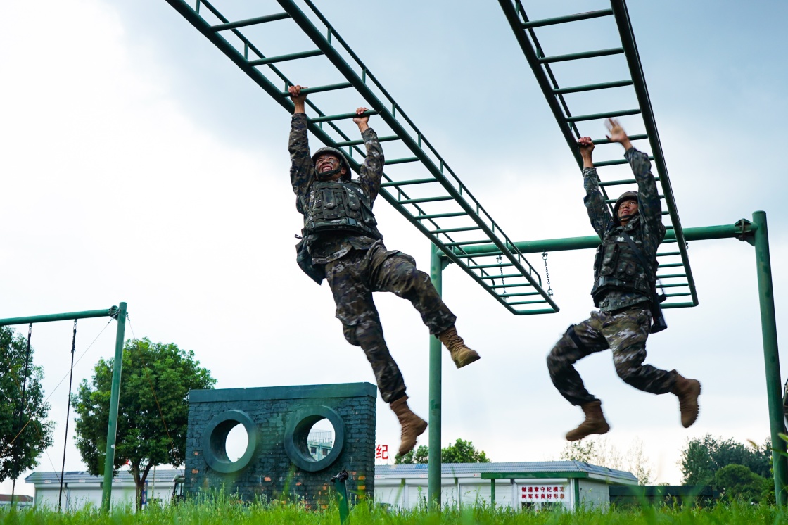 武警安徽总队蚌埠支队组织开展300米障碍训练,特战队员快速通过水平悬梯障碍(7月31日摄)。