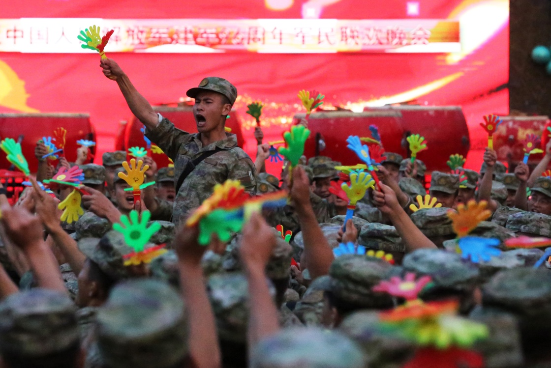 在陆军第75集团军某旅军民联欢晚会现场,官兵们在拉歌(7月30日摄)。