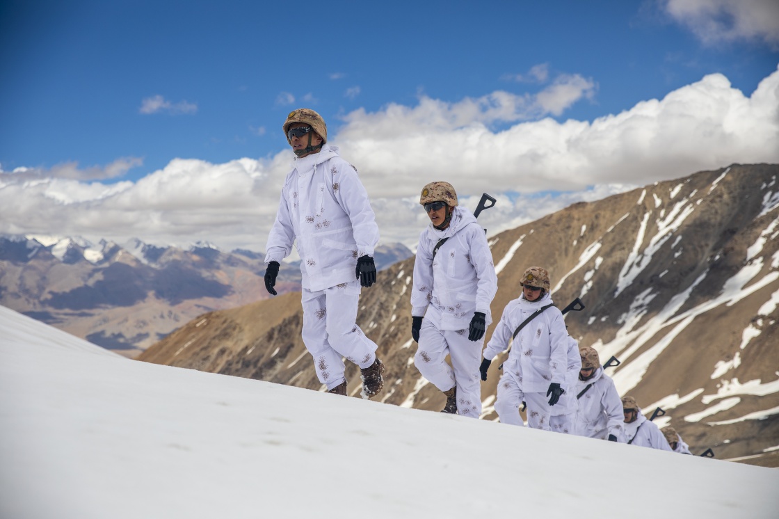 驻守在“生命禁区”的陆军某边防团官兵踏雪向点位前行(7月31日摄)。