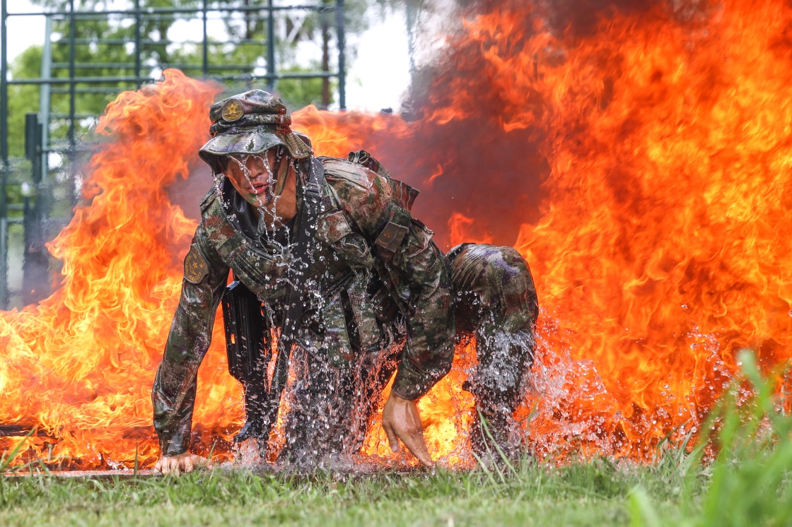 陆军第72集团军某旅组织官兵进行极限课目训练,一名战士穿越火障(7月30日摄)。
