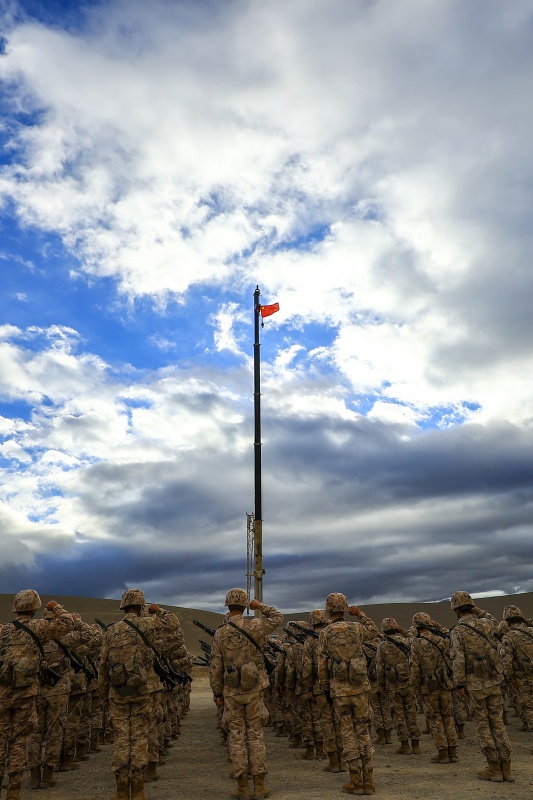 8月1日,新疆军区某合成团在喀喇昆仑高原举行升国旗仪式,官兵们在五星红旗下重温军人誓词。