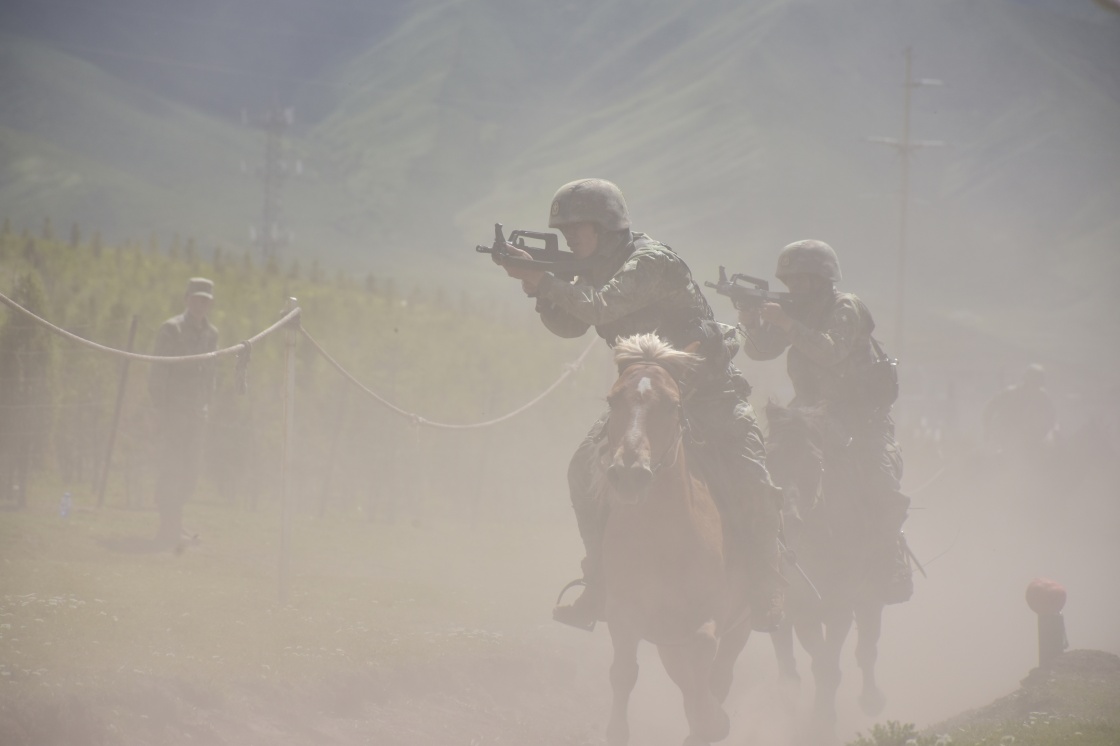 驻守在青藏高原腹地的陆军第76集团军某骑兵连展开多项实战化课目训练。这是官兵们在乘马射击(7月30日摄)。