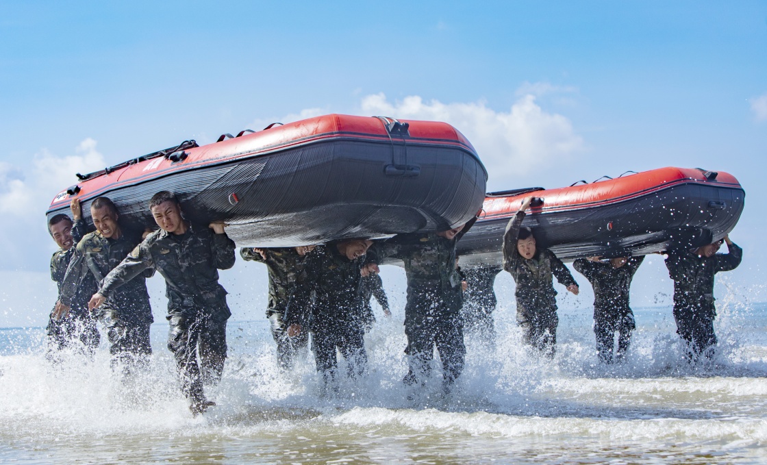 武警广西总队防城港支队官兵组织扛舟行进训练(7月31日摄)。