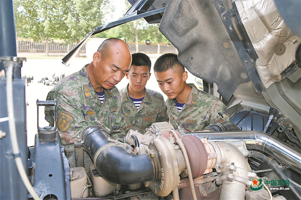 王世纪(左一)在教练场开展车辆排故保养实车教学。唐家起摄
