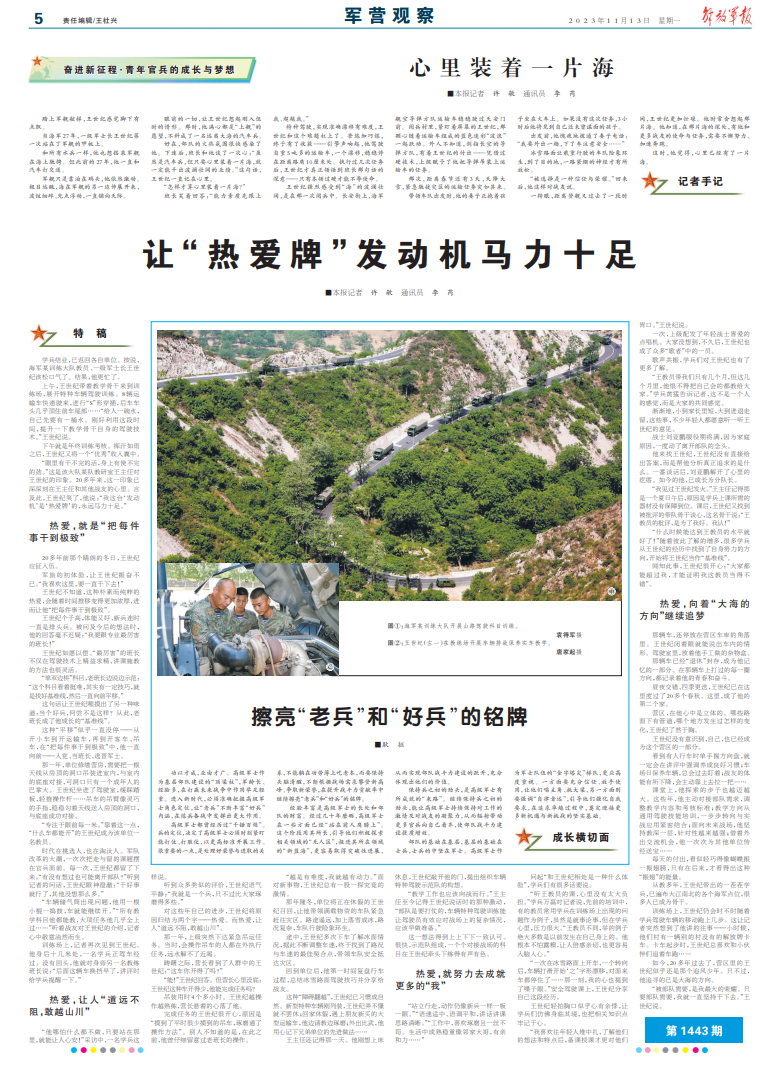 好在,部队的火热氛围很快感染了他。下连后,班长和他谈了一次心:“虽然是汽车兵,但只要心里装着一片海,就一定能干出波澜壮阔的业绩。”这句话,王世纪一直记在心里。