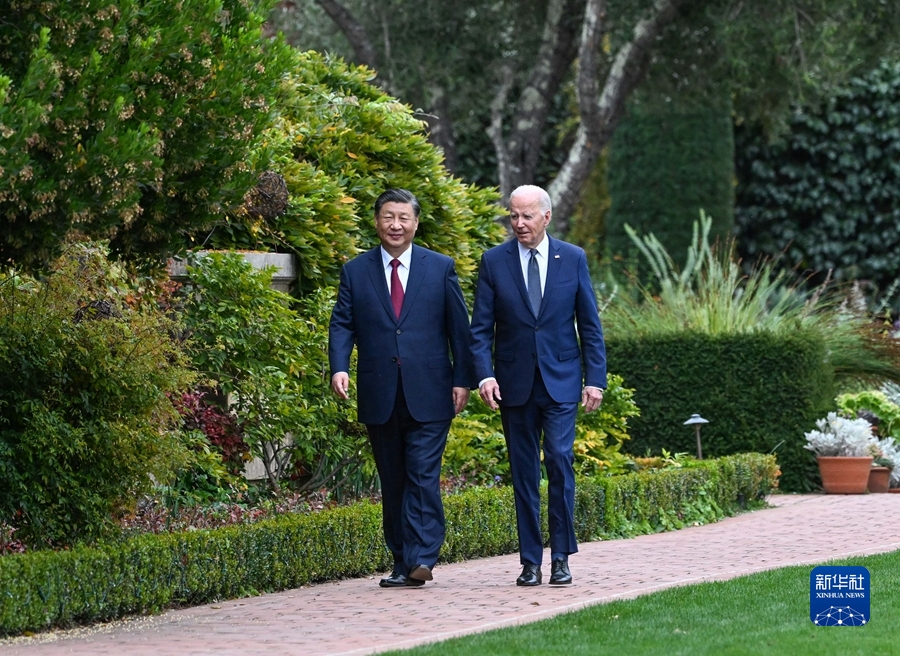 当地时间11月15日,国家主席习近平同美国总统拜登在斐洛里庄园举行中美元首会晤。这是会谈后,拜登邀请习近平一道在斐洛里庄园里散步。新华社记者 饶爱民 摄