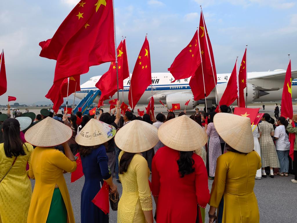 离开河内赴机场途中,当地民众和华侨华人聚集在道路两旁,挥舞中越两国国旗,热烈欢送习近平总书记,并祝贺访问取得圆满成功。
