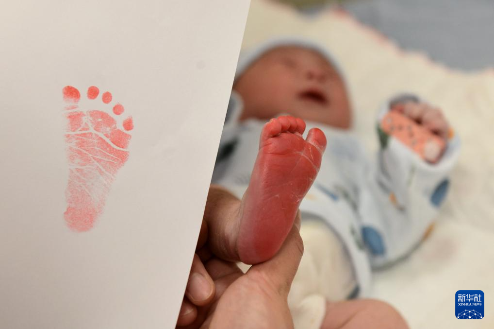 2023年1月22日,在河北省石家庄市妇产医院,医护人员为刚出生的“兔宝宝”留下脚印。