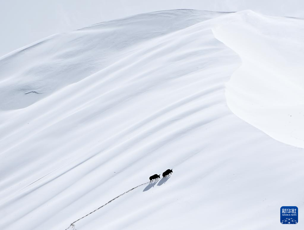 2023年10月16日,野牦牛在阿尔金山国家级自然保护区攀爬雪后的库木库里沙漠。阿尔金山国家级自然保护区地处新疆巴音郭楞蒙古自治州东南部,属藏北高原昆仑山中部地区,平均海拔4580米,面积约4.5万平方公里,是我国高原荒漠生态系统典型代表。