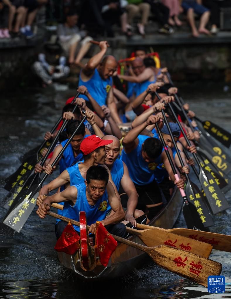 2023年6月22日,桨手在广东佛山叠滘端午龙船漂移赛奋力挥桨。