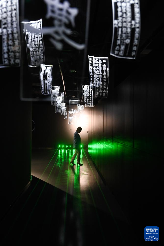 2023年4月21日,一名读者在浙江省嘉兴市图书馆元宇宙阅读体验馆内通过触碰不同光线来感受音律的变化。