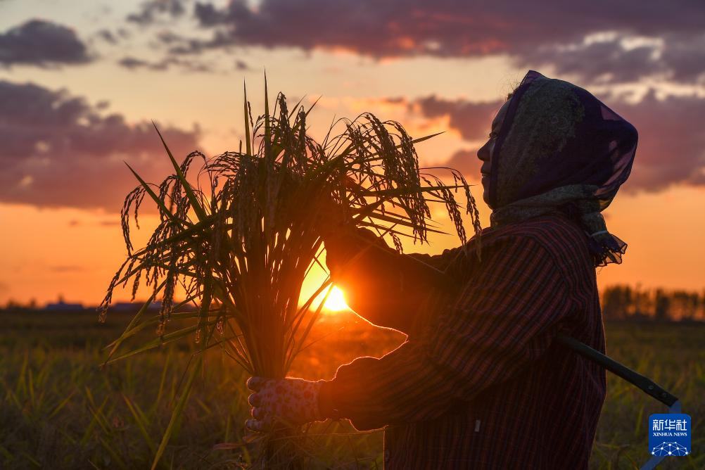 2023年9月12日,吉林省吉林市永吉县万昌镇花家村的农民在收割水稻。万昌镇位于“世界黄金水稻带”,2023年水稻种植面积12.5万亩,是吉林省水稻重要主产区之一。