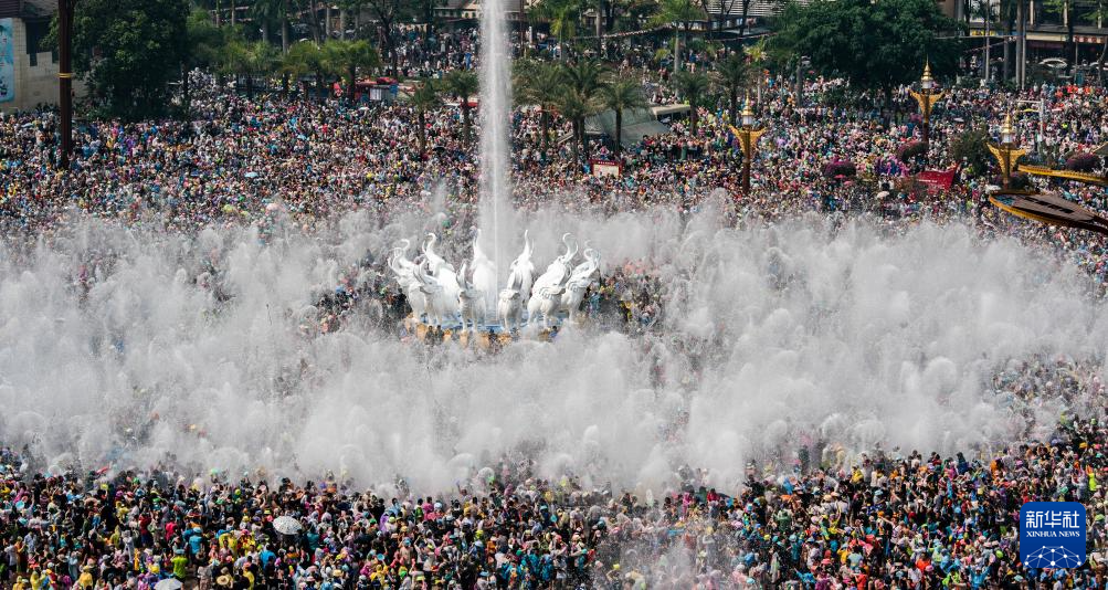 2023年4月15日,人们在云南省西双版纳傣族自治州景洪市泼水广场泼水狂欢。