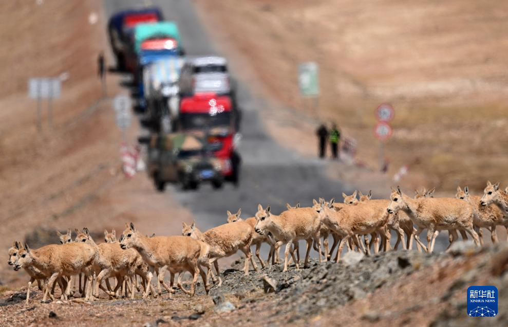 2023年5月29日,在青海可可西里,一群雌性待产藏羚羊通过青藏公路。