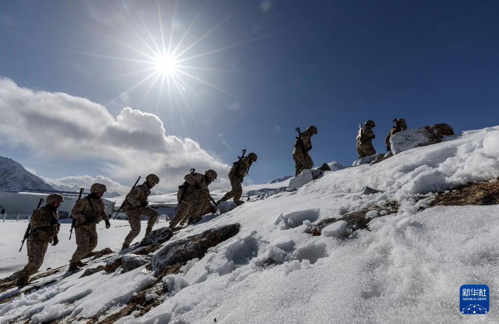 2023年4月13日,新疆军区某边防团红其拉甫边防连的战士在巡逻。红其拉甫边防连常年担负中国巴基斯坦边境线近百公里的守防任务。驻地平均海拔4700多米,最低气温零下40多摄氏度,含氧量不足平原一半。边防连被中央军委授予“卫国戍边模范连”荣誉称号。