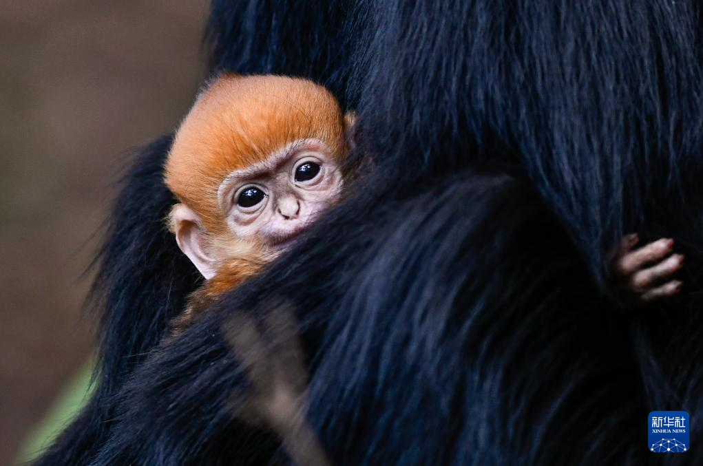 2023年4月30日在贵州麻阳河国家级自然保护区拍摄的黑叶猴幼猴。新出生的黑叶猴毛色呈金黄色,几个月后逐渐变成黑色。近年来,贵州麻阳河国家级自然保护区严格管控黑叶猴活动区域人类活动,减少对其栖息地的干扰,采取专人管护等措施,加上村民爱猴护猴意识的逐年提高,保护区内的黑叶猴数量在逐年增加。