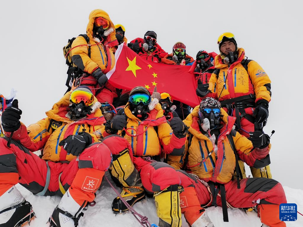 2023年5月23日,科考登顶队员在珠峰峰顶展示国旗。5月23日12时30分许,2023年珠峰科考13名登顶队员成功登顶地球之巅珠穆朗玛峰。这是我国珠峰科考继2022年之后,再次突破8000米以上海拔高度。