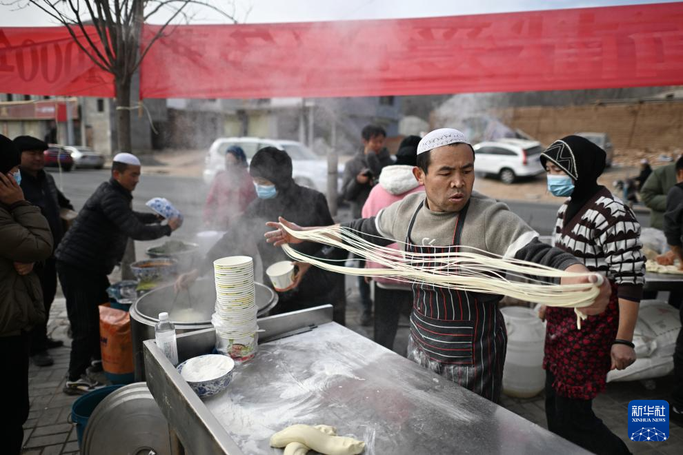 2023年12月20日,在青海省海东市民和县官亭镇,一家拉面店店主不顾自家在地震中受损的店铺,支起锅灶为乡亲们免费提供拉面。这是店员和附近帮忙的村民在拉面摊上忙碌。