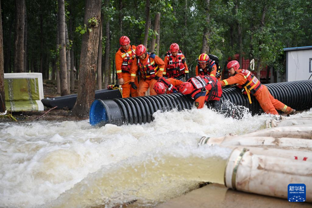 2023年8月6日,在河北省涿州市刁窝镇东张村,唐山消防救援支队队员在进行排涝作业。随着河北省涿州市部分受灾地区水势逐渐消退,当地居民、志愿者和消防救援人员在涿州市多个村庄开展清淤、消杀、排涝等灾后修复工作,争取将损失降到最低。