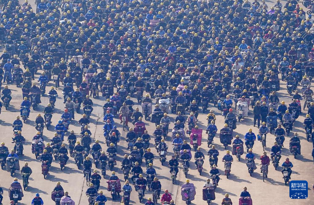 2023年12月5日,在位于江苏省泰兴市的江苏扬子鑫福造船有限公司,工人在中午下班时骑车离开厂区。