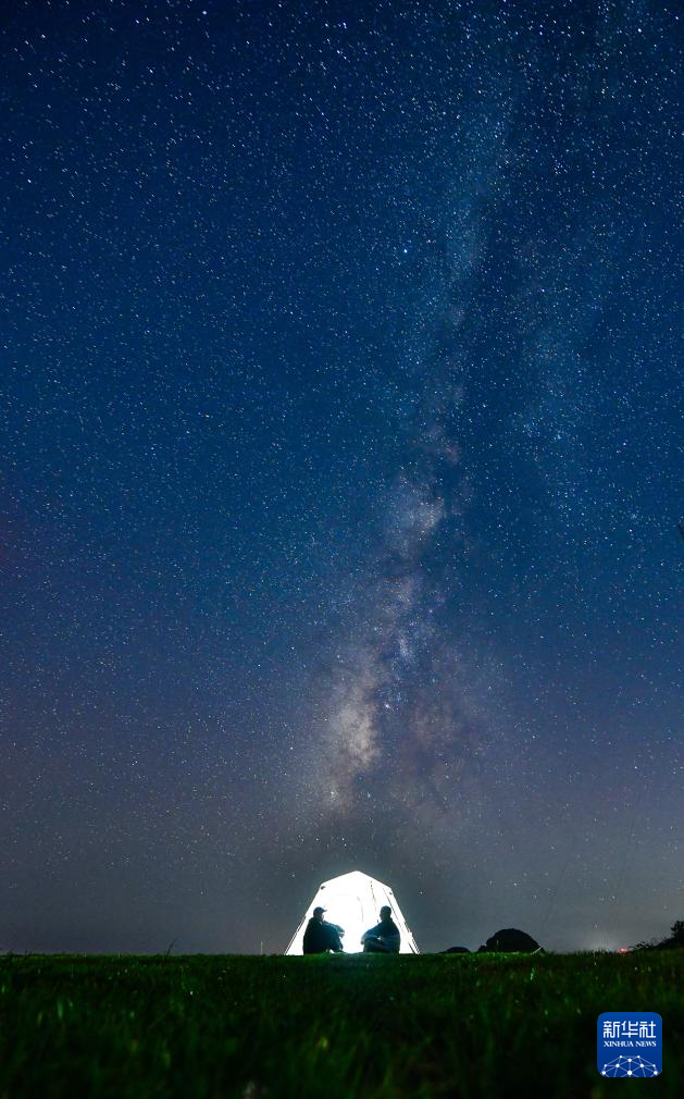 2023年9月15日,游客在贵州省兴义市敬南镇竹麻山的星空下露营。