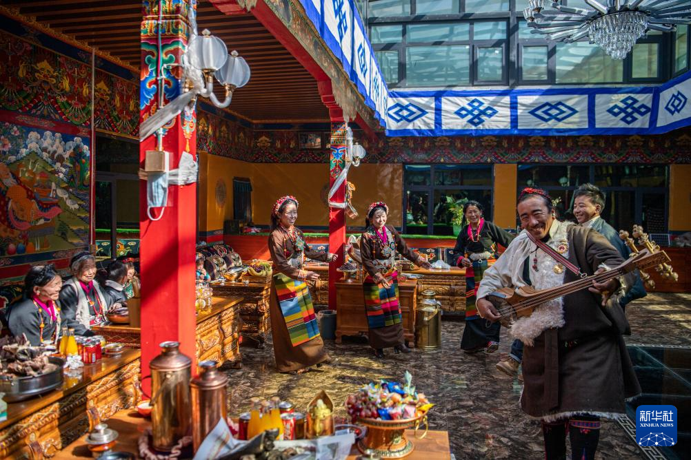 2023年1月22日,在位于西藏日喀则拉孜县扎西宗乡杂村的家中,次旦老人的儿孙们一边弹扎念琴一边跳舞,庆祝藏历农家年。1943年出生的次旦老人在民主改革以前是“差巴”(领种份地,向农奴主支差役的人)。各种名目繁多的差役、赋税榨干了次旦家的收入,剩下的部分只够勉强生活。1959年,雪域高原开启波澜壮阔的民主改革,旧西藏政教合一的封建农奴制度被彻底废除,次旦一家也迎来了春天。如今,她家已是四世同堂,一家11口人住在新建的二层小楼里,生活富足。