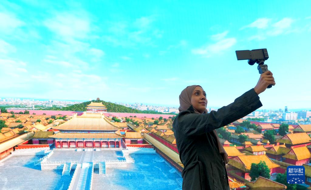 2023年10月16日,在位于北京的第三届“一带一路”国际合作高峰论坛新闻中心,来自马尔代夫的记者在高清大屏幕前进行报道。