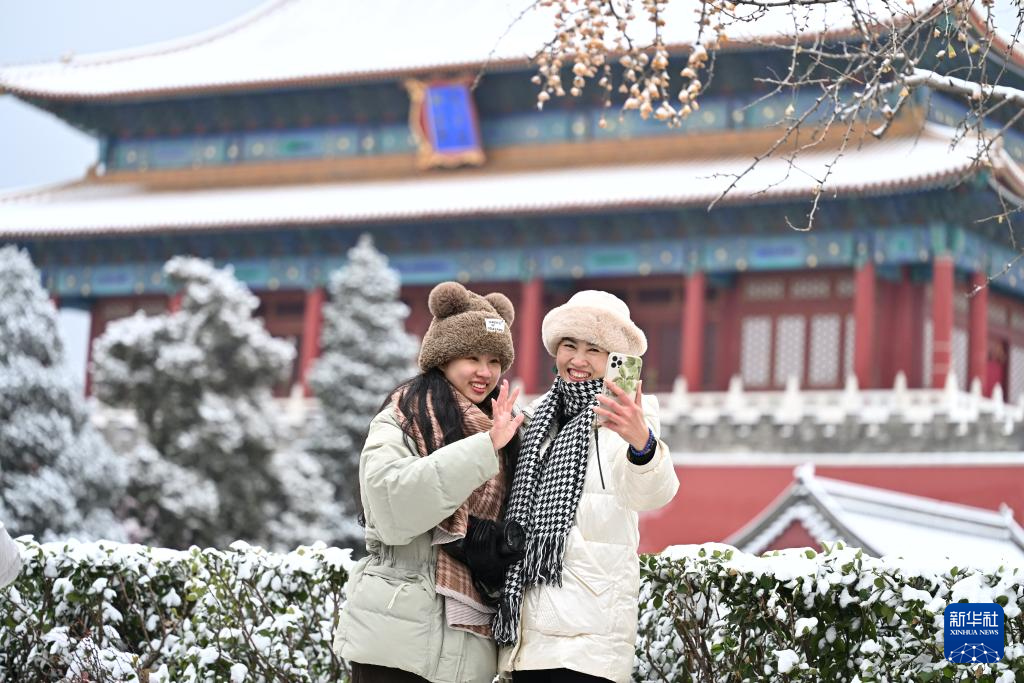 2023年12月11日,一场降雪过后,游客在北京故宫神武门前和家人视频连线。