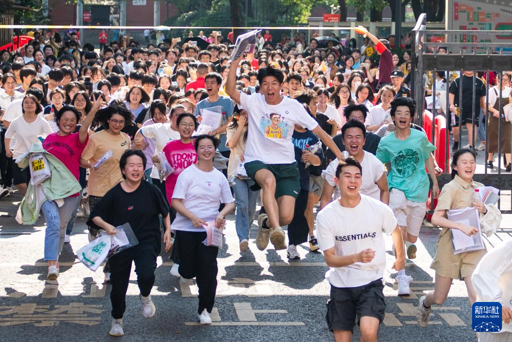 2023年6月9日,在长沙市第一中学考点,考生在高考结束后庆祝。
