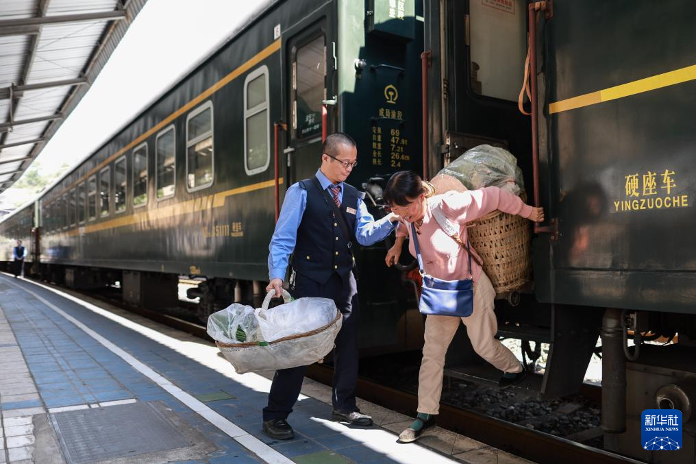 2023年10月17日,往返于贵州遵义、重庆间的5630次列车到达贵州桐梓站后,村民携带农产品下车。往返于遵义、重庆间的5630/5629次列车自1993年4月开行以来,一直是沿线山区居民出行的重要交通工具。由于票价低廉、停靠站点多,部分沿线的村民通过这趟列车携带农产品进城售卖,三十年来,这趟“慢火车”一直默默带动着当地社会经济的发展。