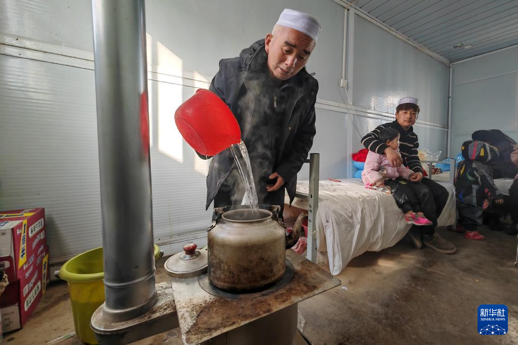 2023年12月21日,在甘肃临夏积石山县大河家镇梅坡村活动板房安置点,受灾群众在活动板房内的火炉上烧水。当日,200余座防风、保暖、阻燃的活动板房在积石山县大河家镇梅坡村搭建完成并陆续投用,当地安置特困人员、老人、孩子多的家庭优先入住。