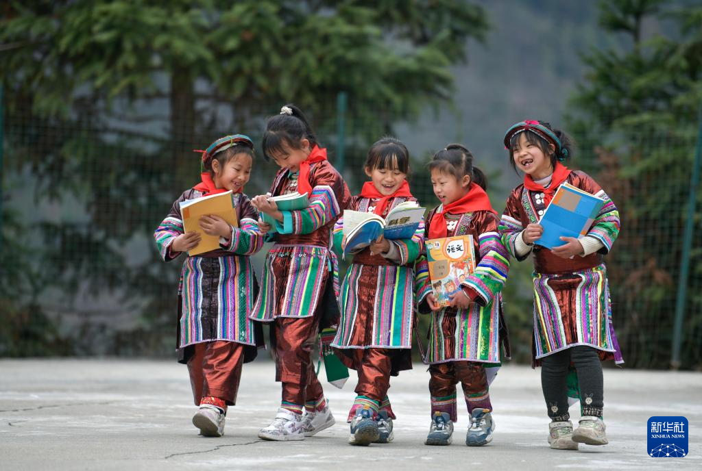 2023年2月16日,在贵州省从江县西山镇中寨教学点,领到新书的瑶族学生在一起交流。位于贵州省黔东南苗族侗族自治州从江县大山深处的西山镇中寨教学点是一所目前仅有1名老师和17名学生的“微小学”,全校学生均为瑶族。虽为教学点,但学校开设的文化、体育、劳动、民族文化等课程一样都不少。近年来,教学条件逐渐改善,学生享有免费午餐,教师以校为家,村民尊师重教,这所深山瑶寨“微小学”正在发生翻天覆地的变化。