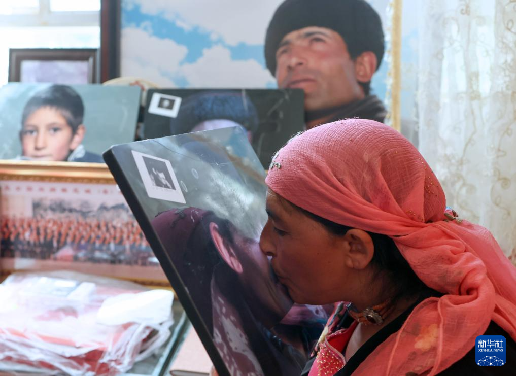 2023年9月4日,在新疆塔什库尔干塔吉克自治县,拉齐尼的姐姐阿依木汗·巴依卡亲吻弟弟拉齐尼的照片。“时代楷模”拉齐尼·巴依卡2004年从部队退伍后,接替戍边38年的父亲巴依卡成为一名护边员,2021年1月4日,为解救落入冰窟的孩子,41岁的拉齐尼不幸英勇牺牲。拉齐尼牺牲之后被国家追认为烈士。