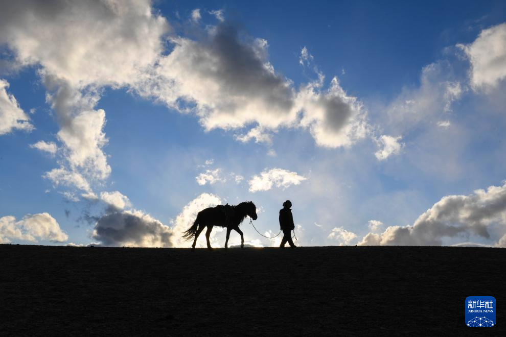 2023年4月12日,在新疆塔城地区巴尔鲁克山,牧民哈布得拉什么·努素普别克牵着马走在春草场的一处高坡上,观看羊群吃草的情况。