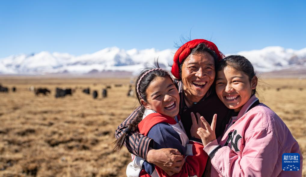 2023年11月15日,西藏当雄县中学学生斯曲卓玛(右)和爸爸、妹妹一起。今年15岁的斯曲卓玛,是当雄县中学八年级六班的学生。斯曲卓玛和班里其他51名同学一起,从草原来到学校,接受现代化的双语教育。近年来,西藏全面落实农牧民子女“上学无负担”措施,农牧民子女受教育水平显著提升。