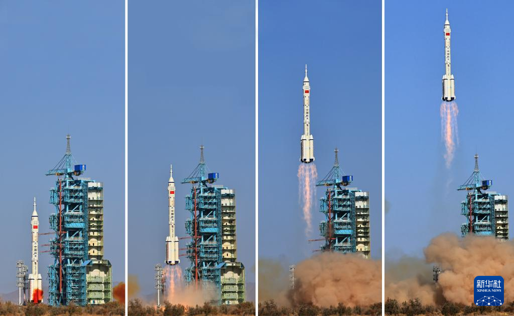 2023年10月26日拍摄的神舟十七号载人飞船发射升空过程(拼版照片)。