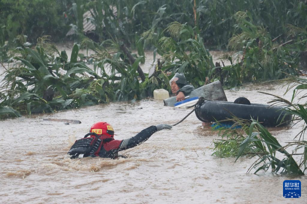 2023年8月4日,哈尔滨市森林消防支队特勤大队消防员在尚志市一面坡镇万山村跳入水中,营救被困群众。