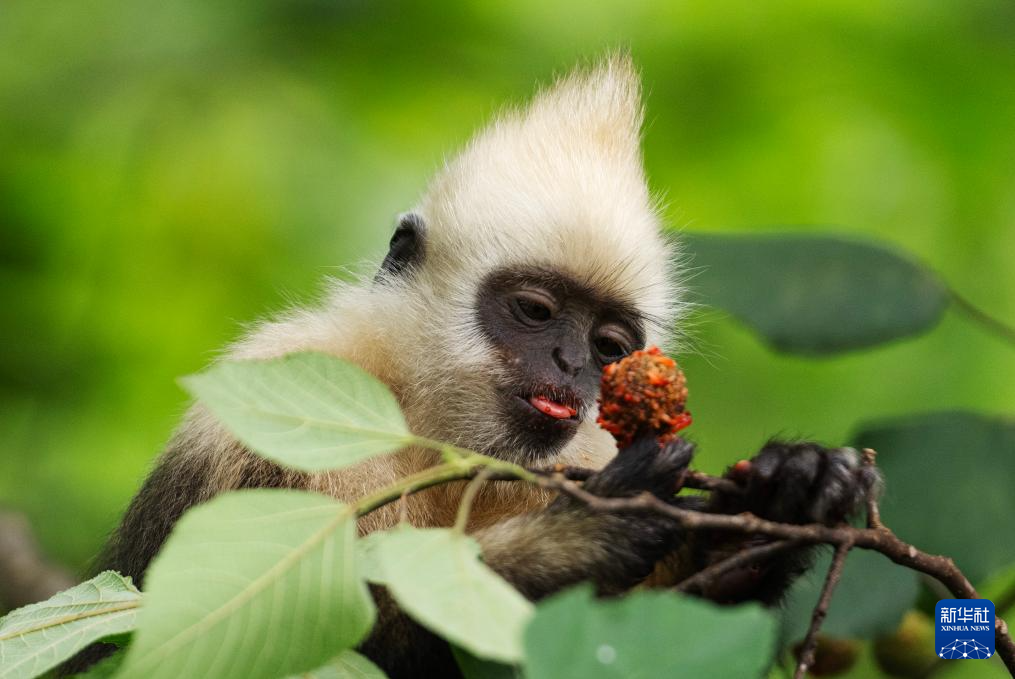 2023年8月4日,在广西崇左市江州区罗白乡的白头叶猴国家级自然保护区板利片区核心区,一只白头叶猴在吃构树的果实。白头叶猴是我国特有的国家一级重点保护野生动物,种群数量稀少,主要分布在广西崇左市左江和明江之间约200平方公里的喀斯特石山地区。